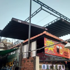 Để làm mái che cho quán nhậu, quy trình khá đơn giản bao gồm việc tạo khung mái và sử dụng một tấm bạt để che phía trên.